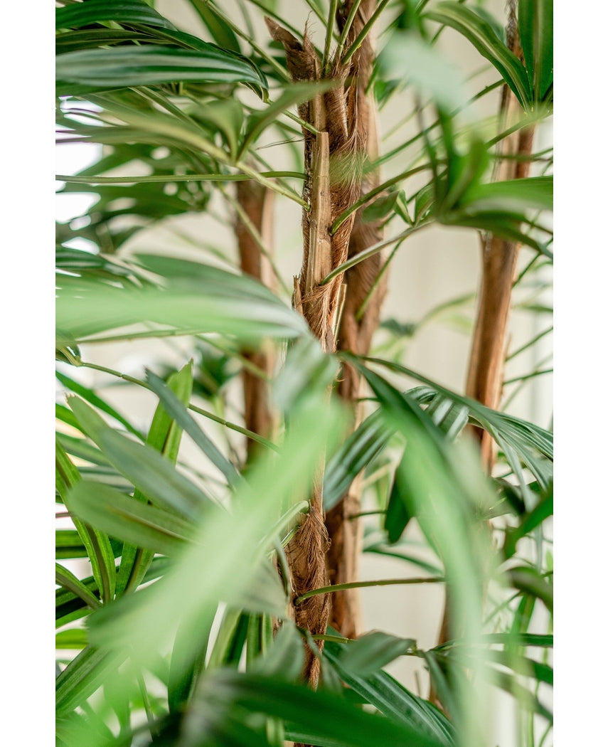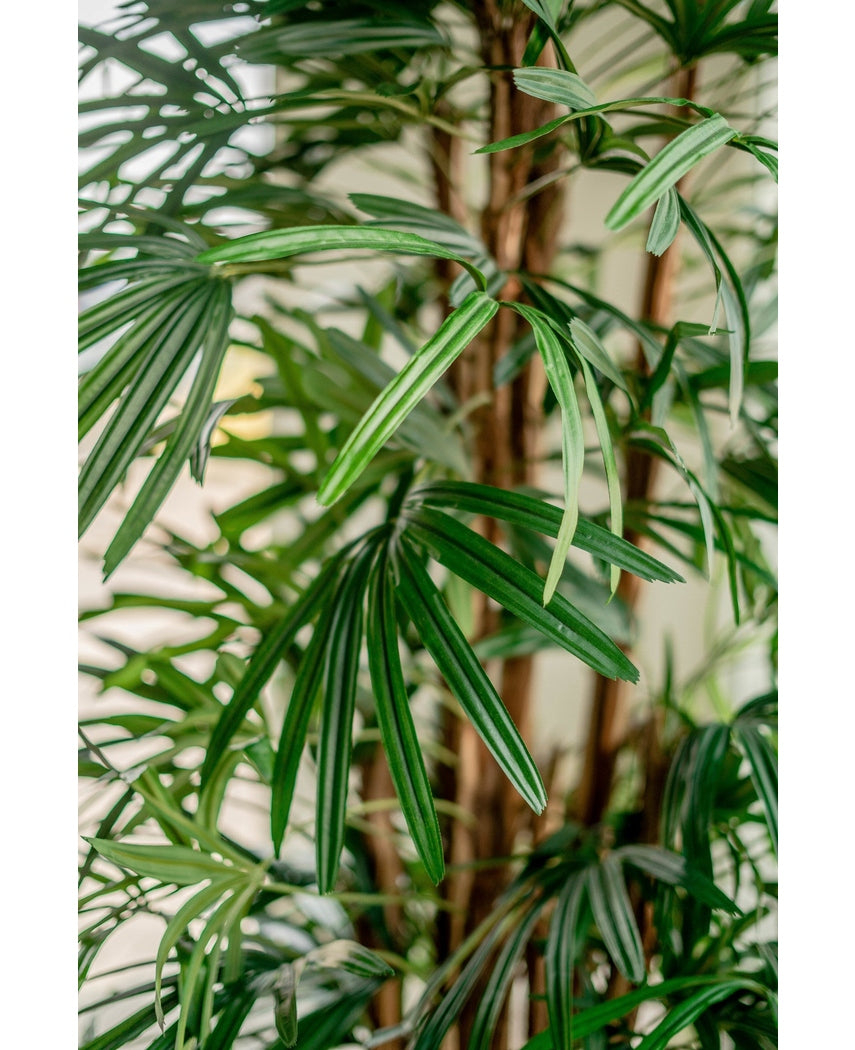 Lady Palm, också känd som Rhapis Palm, är en fantastisk växt som skapar en lugn och inbjudande atmosfär. Denna konstgjorda version av Lady Palm, som mäter imponerande 210 cm, ger dig möjlighet att njuta av den tropiska känslan utan att behöva tänka på vattning eller underhåll.