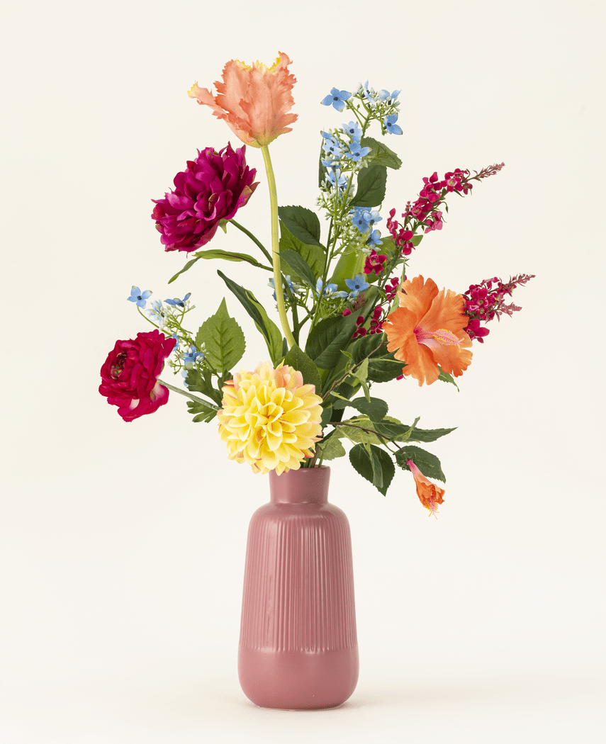 Upptäck den tidlösa skönheten i Confetti Bloom -buketten, en exklusiv sammansättning av blommor med hög kvalitet som blommar upp din interiör. Denna sidenbukett kombinerar elegans och bekvämlighet och består av en glittrande blandning av Dahlia Real Touch, Catnip, Ranunculus, Hibiscus, French Parakeet Tulip, Peony och Wild Hortensea.