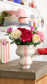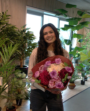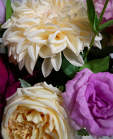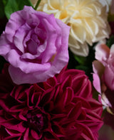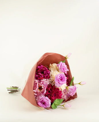Dream Delight - En tidlös blandning av raffinerade lila, rosa och beige nyanser som strålar värme och kärlek. Denna silke konstgjorda blommor bukett består av en mix riktig touch dahlias, rosor och eustoma. Den noggrant sammansatta sidbuketten levereras i vackra Bordeaux Red Bouquet -papper, som ger ett extra lyxigt utseende och gör den perfekta gåvan för ett speciellt tillfälle.