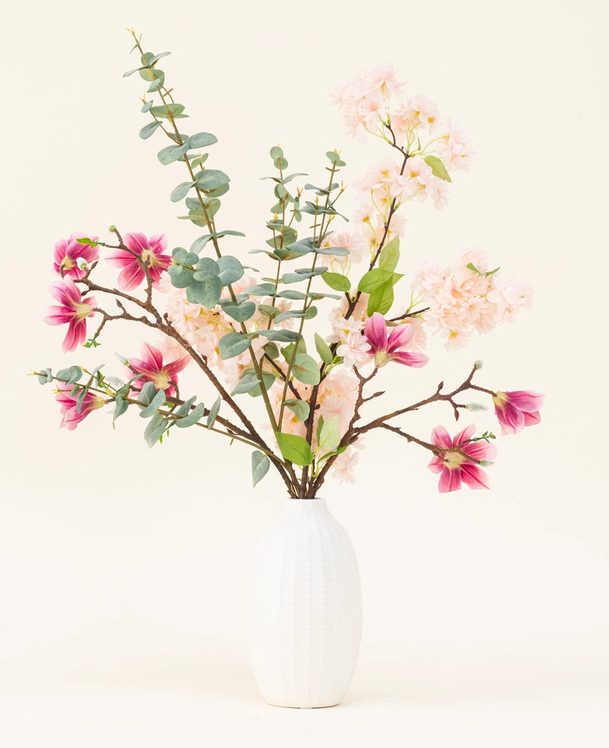 Ta med en touch av förfining och lugn in i huset med Silk Artificial Flowers Bouquet Featherlight Florals. Denna elegant sammansatta bukett består av tre noggrant utvalda grenar: den tidlösa skönheten i Magnolia, den färska mjukheten hos eukalyptusblad och den romantiska touch av ljusrosa körsbärsblomning.