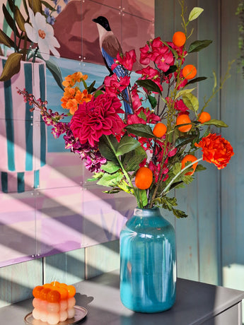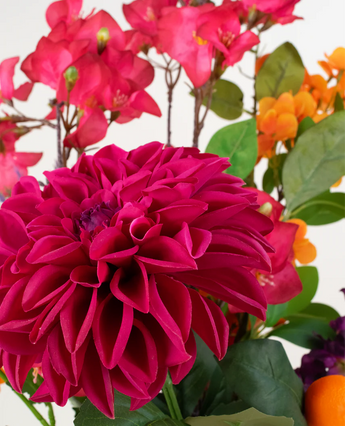 I buketten hittar du sommartoppare som Snowball Real Touch, Dahlia Real Touch, Bougainvillea, Ranunculus, Peony, Mandarin och Distel. Kombinationen av dessa blommor ger en lekfull och solig helhet med rika färger och naturliga former.