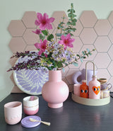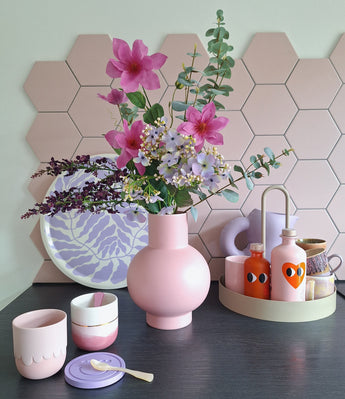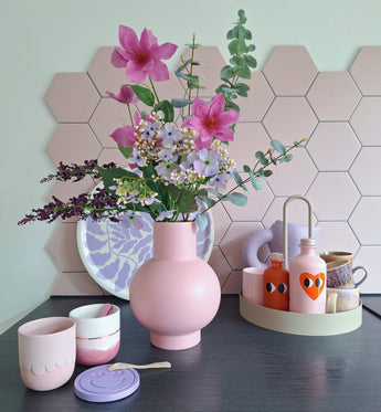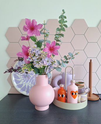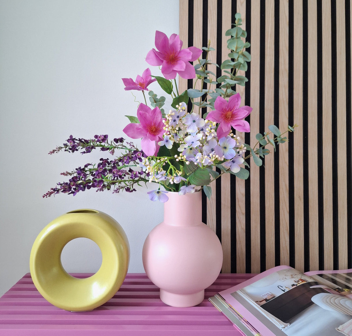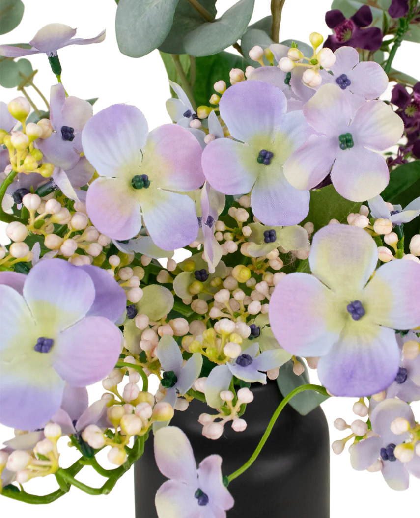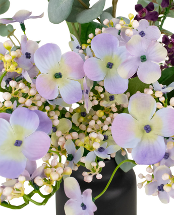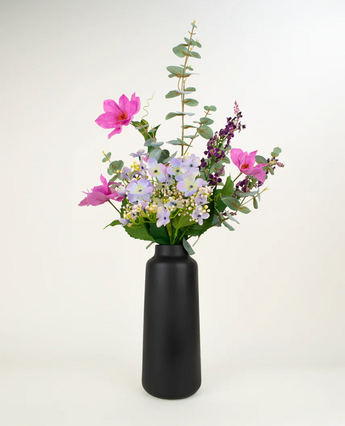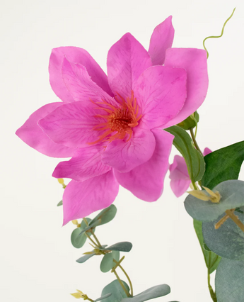 Kompositionen består av livliga blommor med verklig beröringsfinish, inklusive den förtrollande rosa klematisen, en full pion, lekfullhet av kattblommor och frodiga eukalyptusgrenar. Den noggrant utvalda blandningen av strukturer och nyanser ger en känsla av harmoni som fortsätter att förtrolla den säsongen efter säsong.