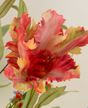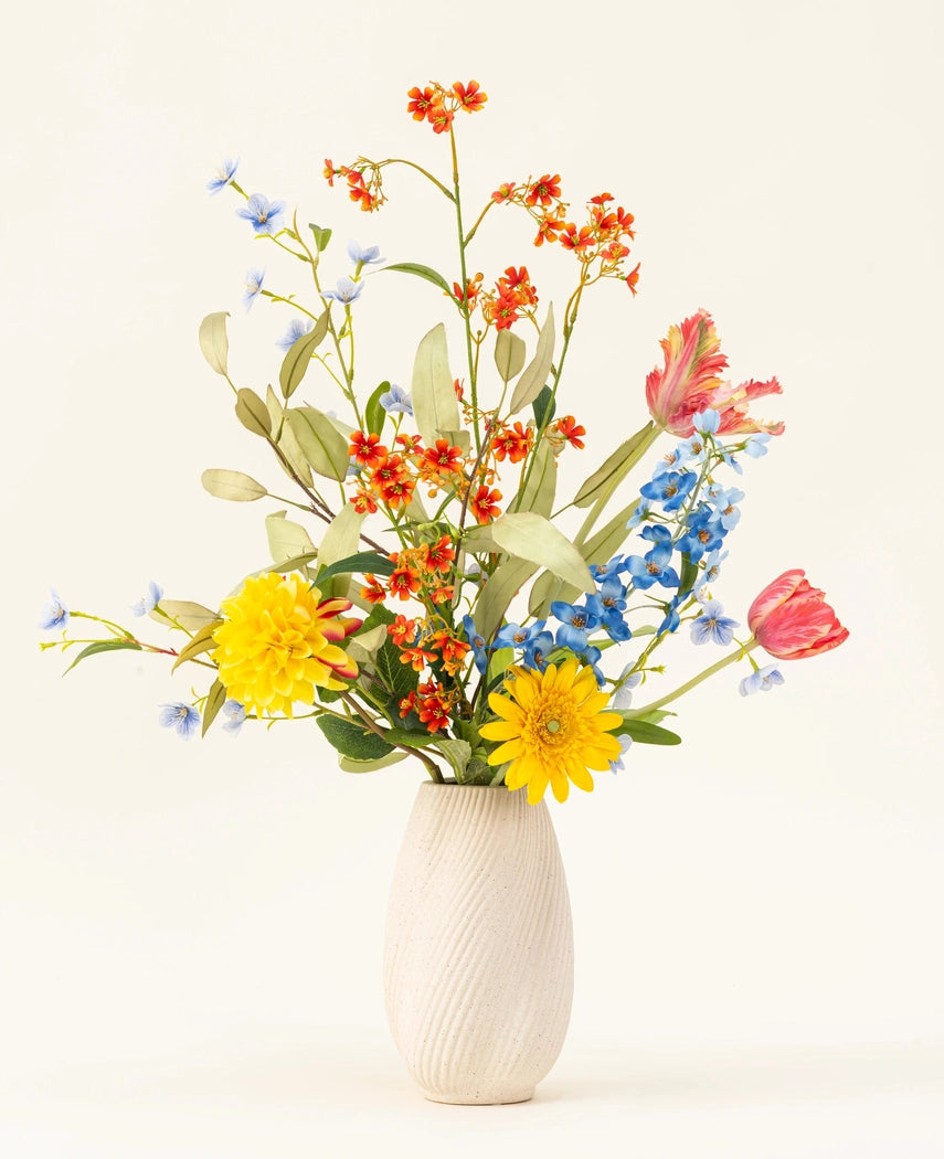 Ta med en fräsch och livlig atmosfär i huset med limonadträdgården Silk Artificial Flowers Bouquet. Detta exklusiva arrangemang, med en höjd av 85 cm, kombinerar de vackra färgerna och eleganta formerna av Gerbera, Delphinium, French Parakeet Tulp, French Tulip, Amaryllis och Dahlia.