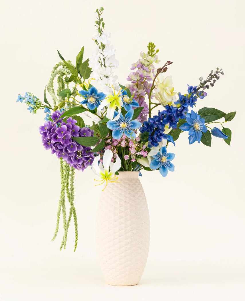 I den här buketten hittar du bland annat den graciösa fiolen, delphinium, orkidén verklig touch deluxe, gips, amaranthus och olika typer av klematis. Den frodiga hortensia, snöbollens verkliga beröring och Gloriosa verkliga beröring bidrar också till den rika strukturen och skiktningen av arrangemanget. Delphinium Real Touch in White ger...