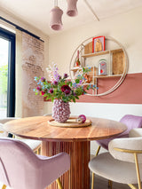 Låt dig själv föras bort av det magiska utseendet på Moonlit Meadow, en lyxig silkblommebukett som fångar skönheten i en mystisk kvällshimmel. Detta eleganta arrangemang består av en harmonisk blandning av blå, lila och aubergine -nyanser, perfekt för ett förfinat och atmosfäriskt utseende i alla inre.