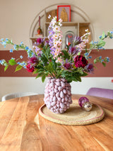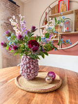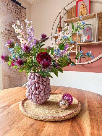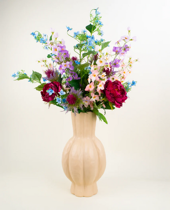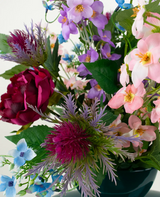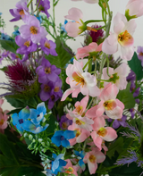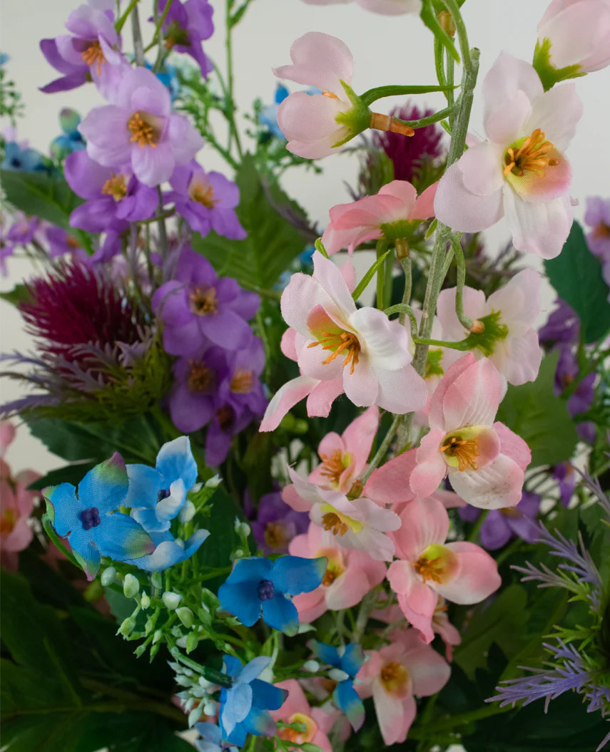 Denna sidenbukett innehåller ett noggrant sammansatt urval av blommor, inklusive den tuffa disteln, det raffinerade delfiniet, den charmiga vilda hortensia och den frodiga ponen. Tillsammans bildar de ett konstnärligt och tidlöst arrangemang som aldrig vill och behåller sin skönhet i flera år.