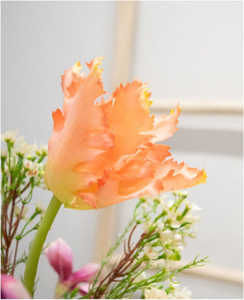 Upplev de mjuka fjäderfärgerna i vår konstbukett, år efter år. Denna förtrollande konstgjorda blommebukett kombinerar förfining och natur i en tidlös komposition. Den graciösa anemonen, delikat vaxblomma och majestätiska franska parakit Tulp säkerställer en lekfull och elegant blick. Tillsammans med den robusta franska tulpan, charmiga magnolia, färskt gröna...