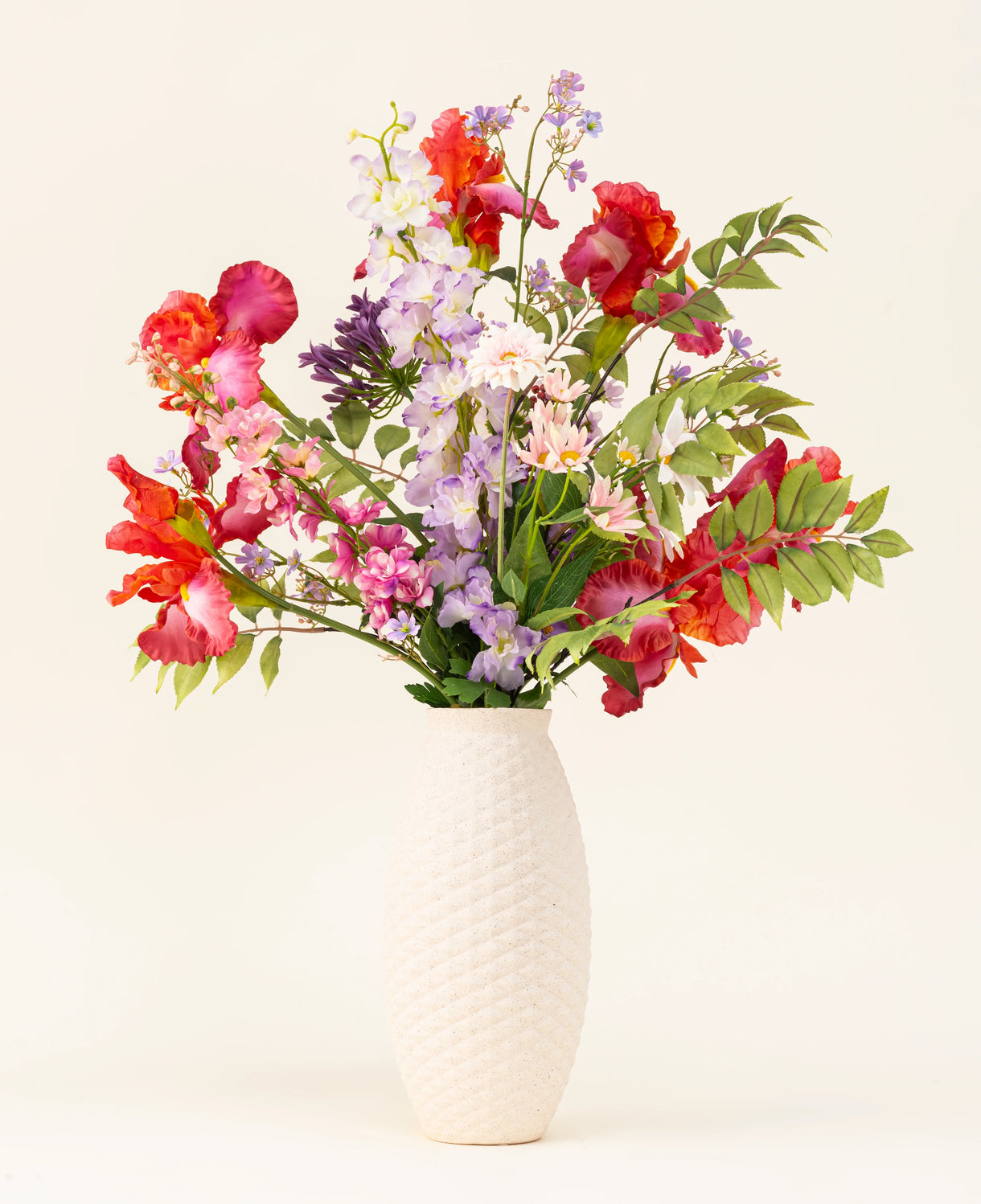 Den röda irisen och den lila riddarsporren ger höjd och intensitet, medan den rosa tusenskönan och den mjuka gerberan ger en...