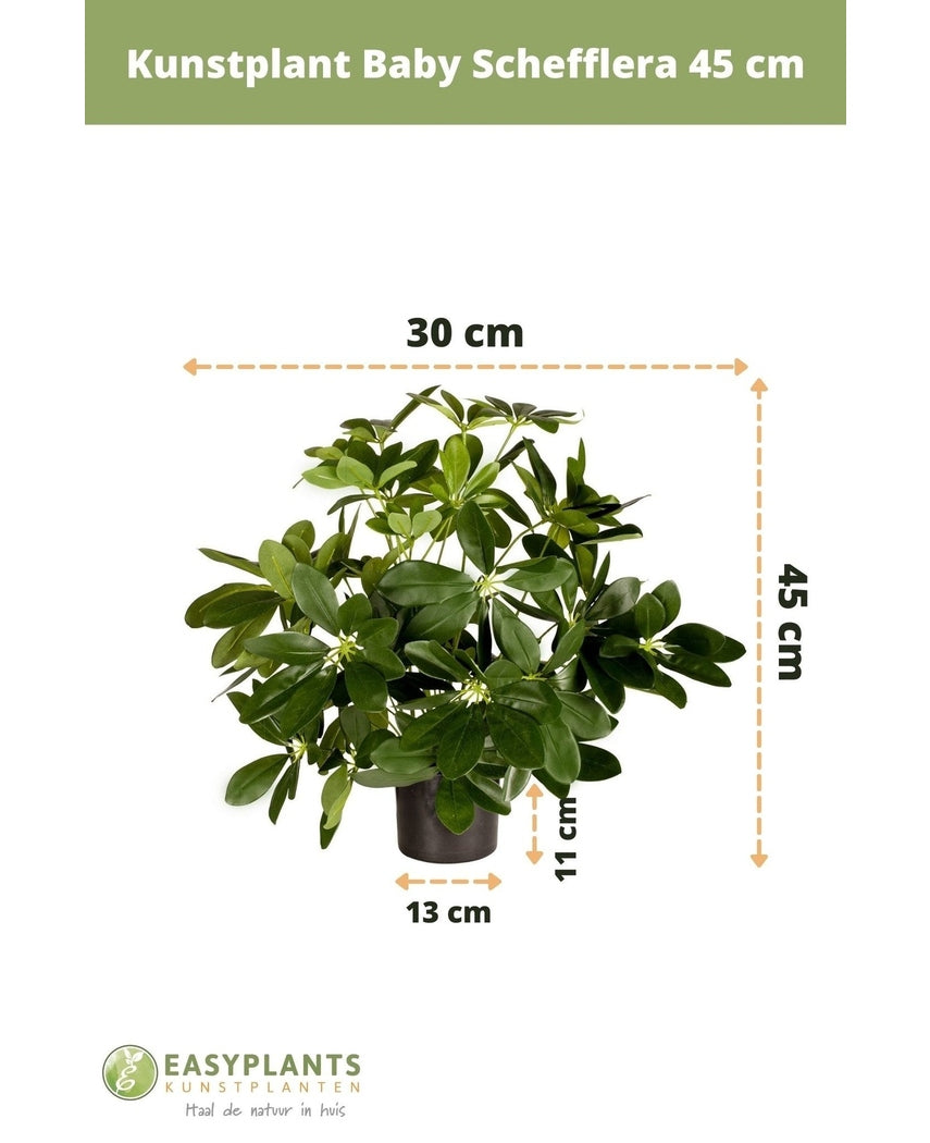 Skapa en grön oas i ditt hem eller kontor med vår konstgjorda växt Baby Schefflera på 45 cm. Denna eleganta växt är perfekt för alla miljöer, oavsett om det är i ett bostadshus, en butik, en skola eller en kontorsbyggnad.