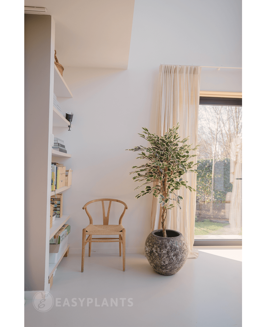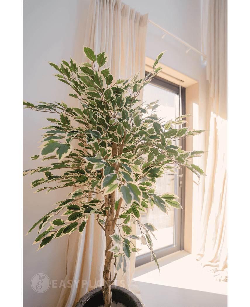 - Naturtrogen design: Med sin realistiska trästam och vackra grön/vita blad, kommer Ficus Fur att lura ögat och ge en känsla av liv utan att kräva någon skötsel.