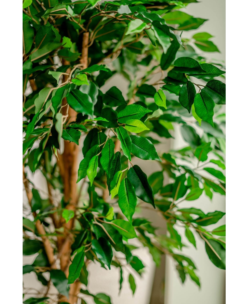 Ficus Green har en vacker bukett av gröna blad som ger ett mycket autentiskt intryck. Med detaljerade vener i bladen och en elegant stam av trärankor, ser denna konstgjorda växt verkligt levande ut.